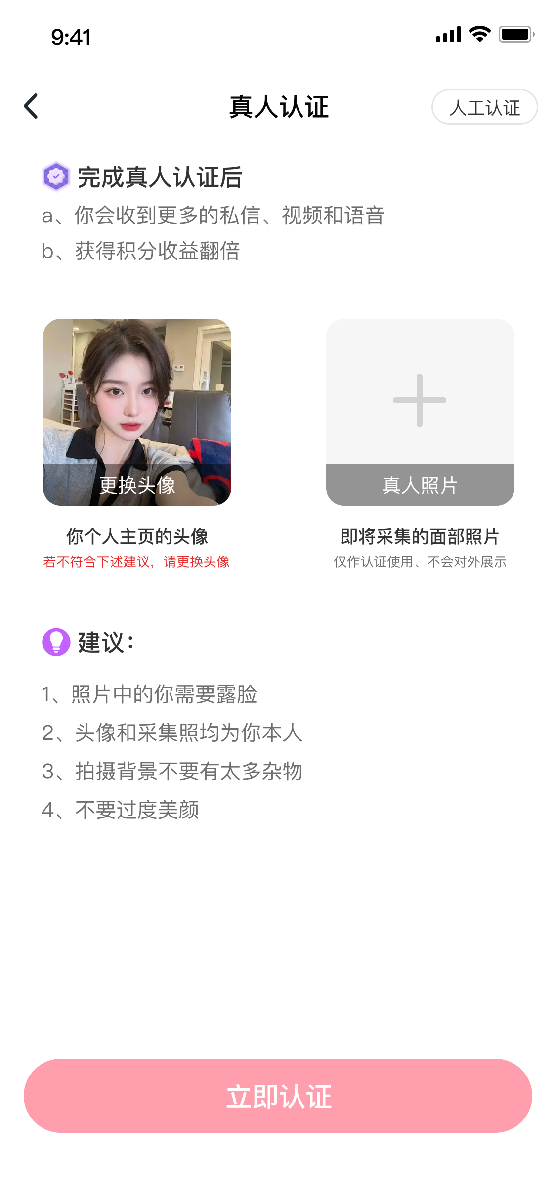 通过AI智能认证(活体检测)+人工审核等多种方式确保用户真实可靠,拒绝照“骗”!
